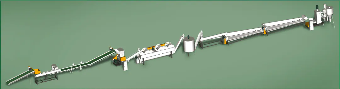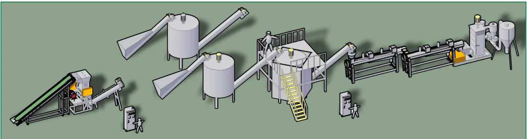 此套生產(chǎn)線主要處理日常生活中所廢舊的牛奶瓶、化妝品瓶、洗發(fā)水瓶、藍(lán)桶、廢舊框、塑料椅、塑料桶等HDPE、PP、PO等浮水硬質(zhì)塑料的再生回收清洗,進(jìn)而可以進(jìn)行造粒后再利用。從節(jié)能、環(huán)保方面為用戶考慮,采用不同的方案流程,適合不同廢塑料的回收,提供配套的分揀輸送帶、高速清洗機(jī)、塑料表面不干膠標(biāo)簽的去除、金屬分離器、水循環(huán)處理系統(tǒng)等。